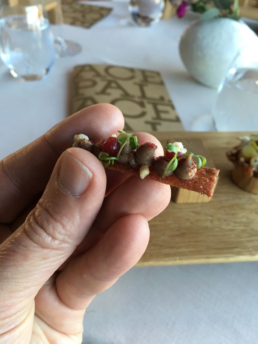 Aluksi pöytään tulivat hauskat pikkusyötävät. Annos, joka Instakaverini mukaan oli ”Surkkian piän hapankorppu” veti suun hymyyn. Pakollinen poro oli paketoitu siihen. Ja maistui hyvältä.